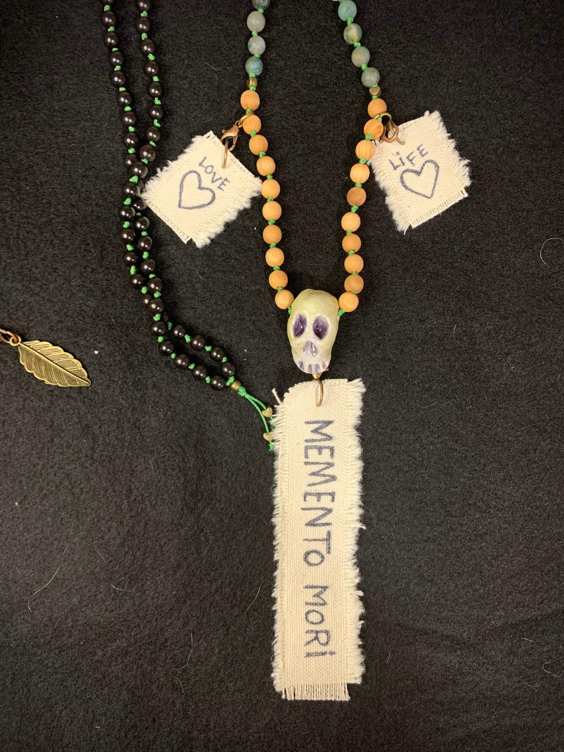 Kallon taustapuolella on rengas, johon on papukaijalukoilla kiinnitetty vanvas suikale jossa teksti: ”Memento mori” eli muista kuolevaisuutesi. Ylempänä on kaksi pienempää canvas-palaa. Toisessa sana ”love” ja toisessa ”life”