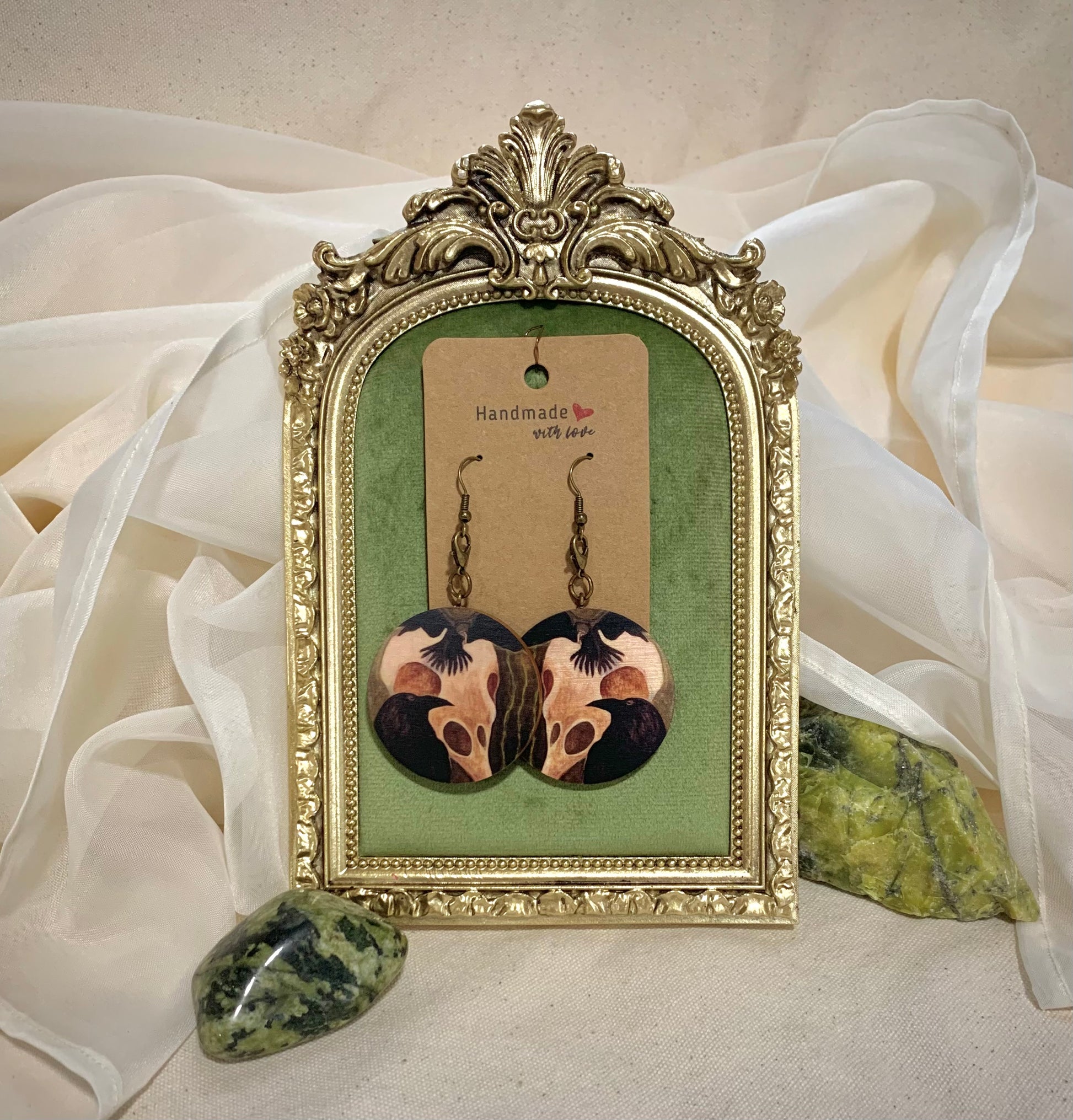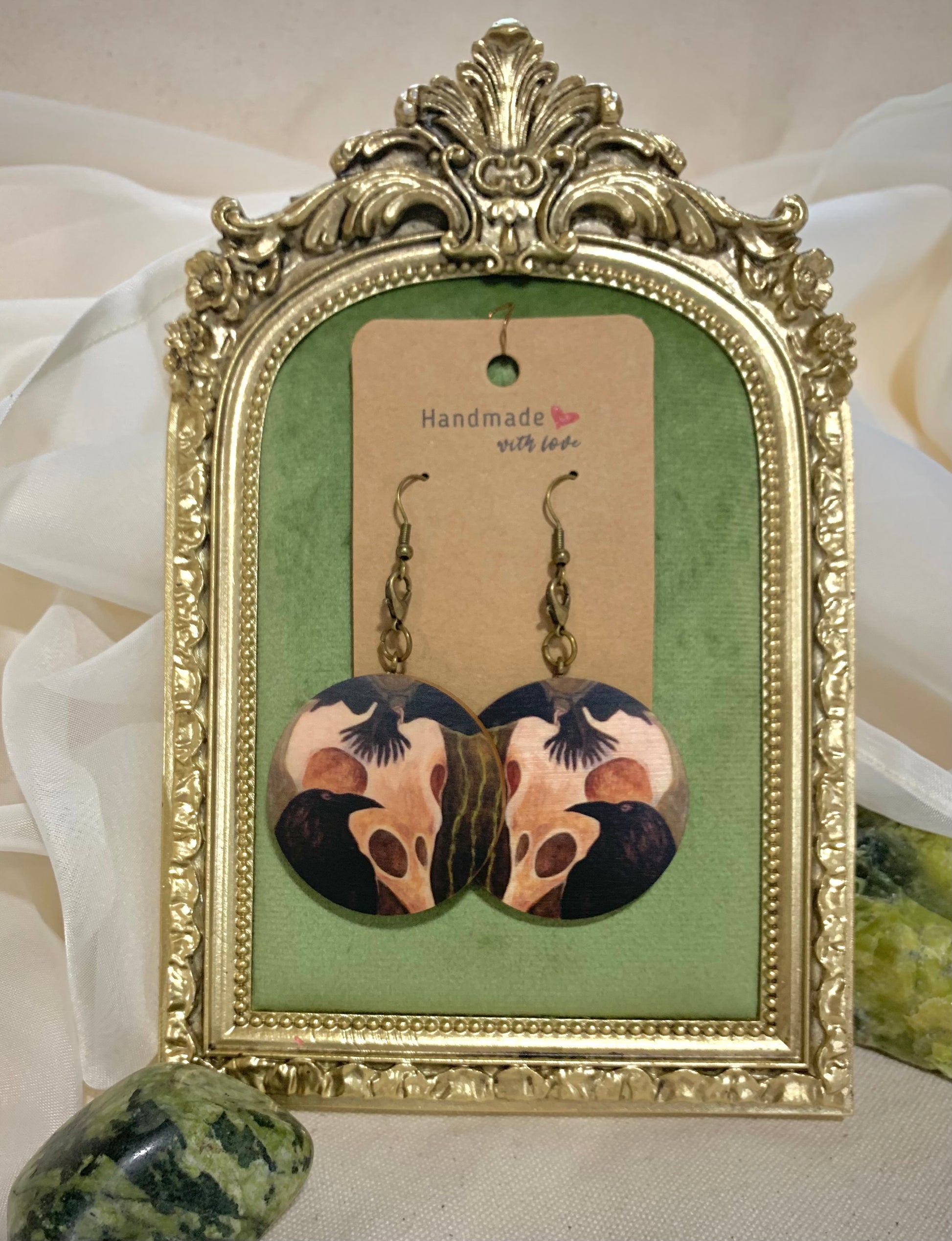 Vaneriympyrään on tulostettu voimaeläinmaalaus. Vaneri on sertifioitua Suomalaista koivuvaneris. Ympyrän halkaisija on n. 4 cm. Metalliosat pronssia, eivät sisällä nikkeliä, kadmiumia tai lyijyä.