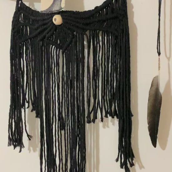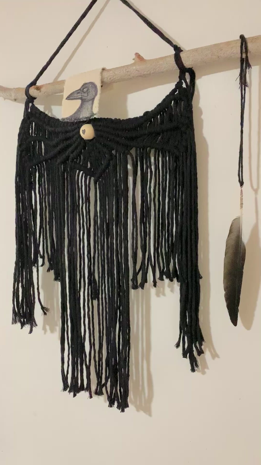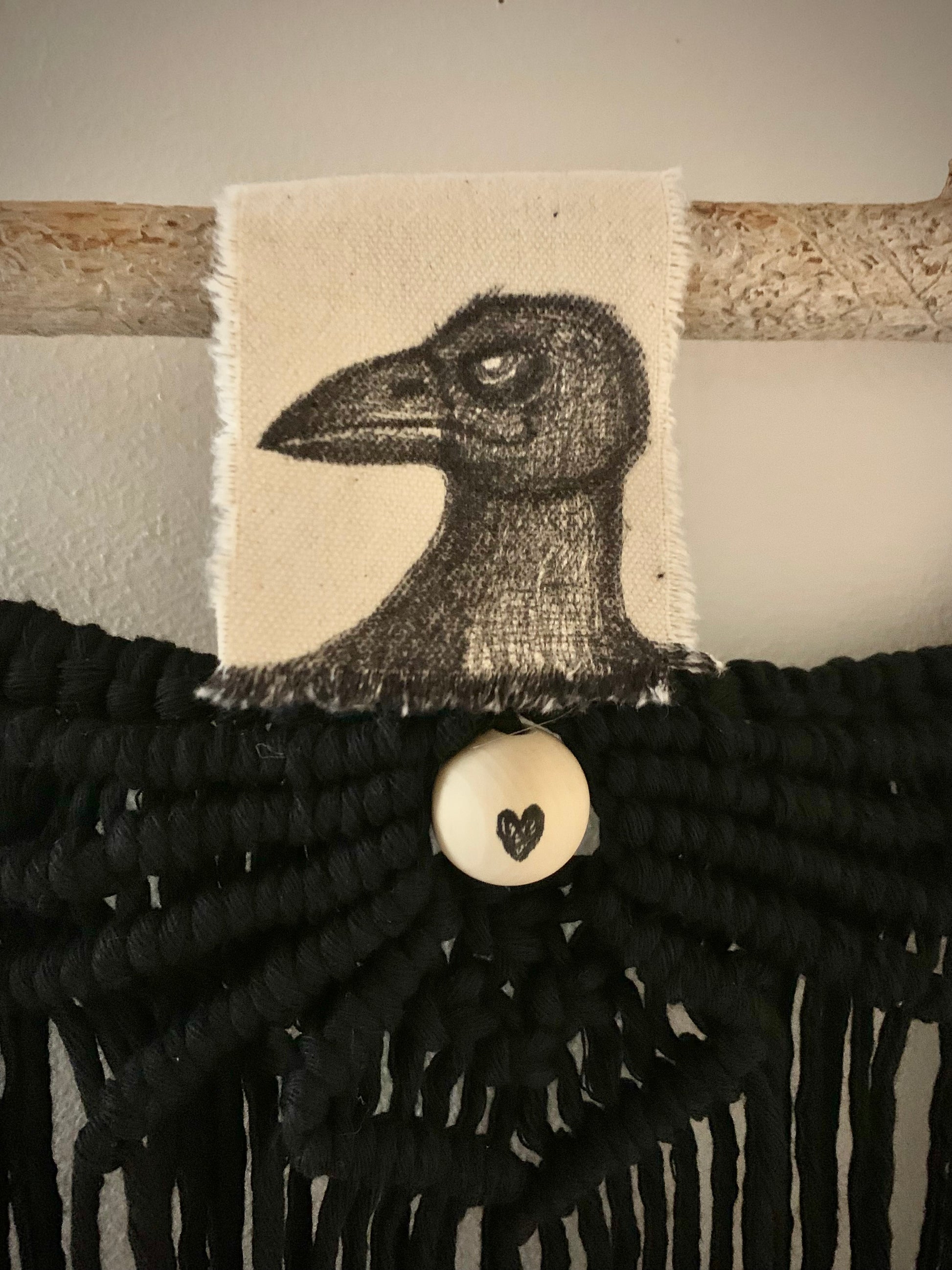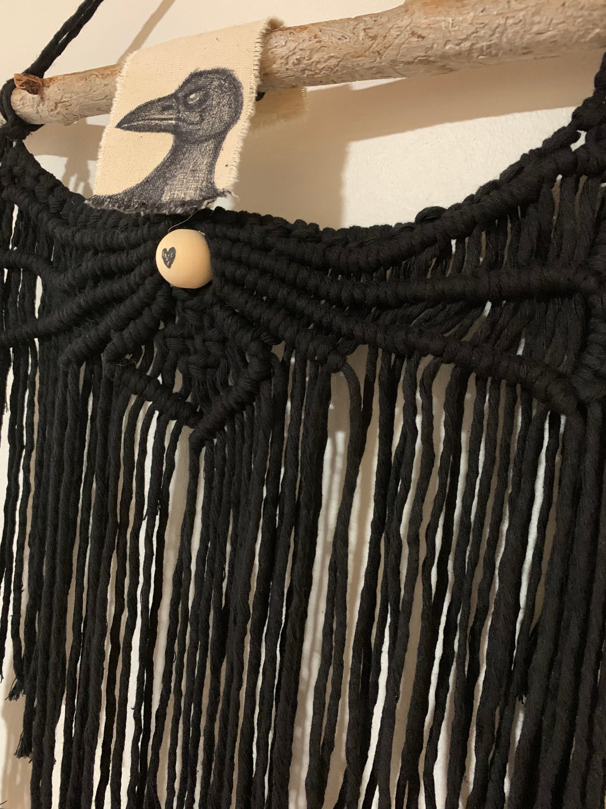 Oman mallin mukaan puuvillanyöristä solmittu macrame yhdistettynä tussipiirrokeen canvaksella. Keppi kerätty metsästä, samoin harakansulka.