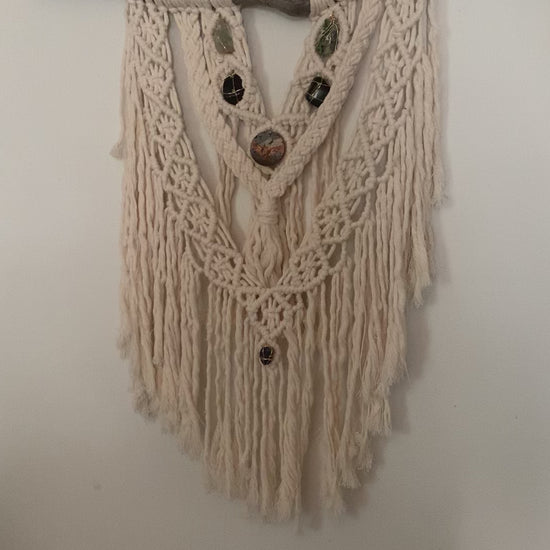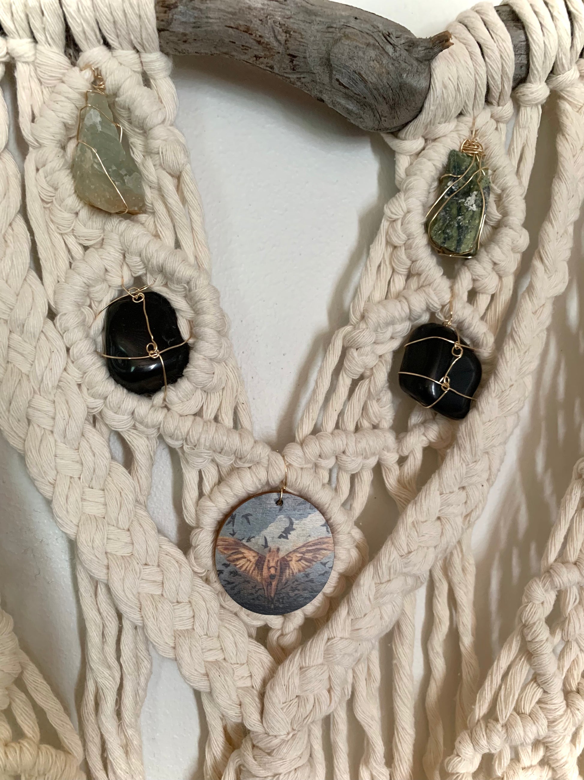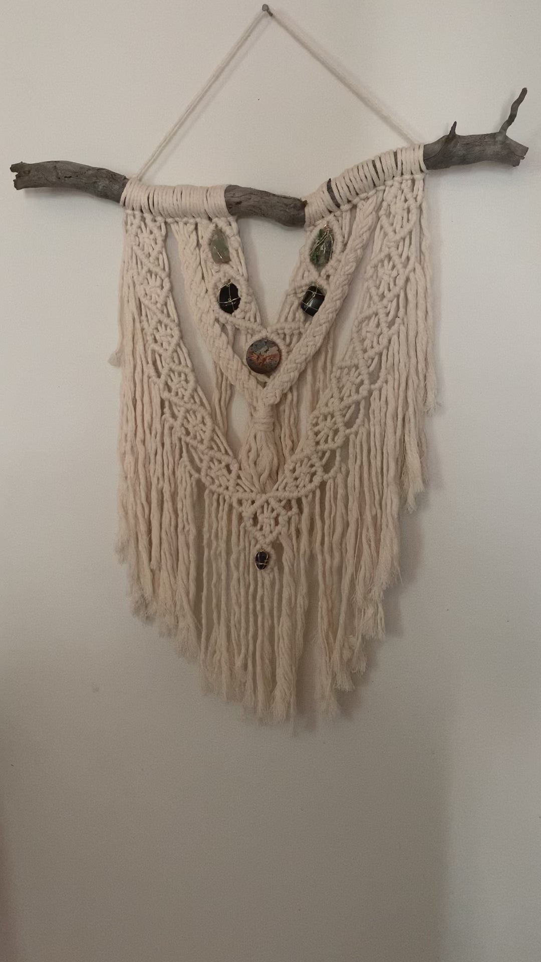 Valkoisesta paksusta puuvillanyöristä solmittu macrame-seinäkoriste, jossa vanerinen eläinlaatta (Pegasus) ja 5 kiveä. Kivet serpentiinejä ja mustaa akaattia.